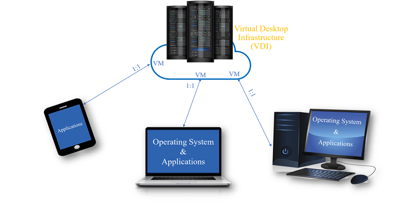رایانه شخصی (PC)، دستگاه تین کلاینت یا موبایل را می توان به عنوان سیستم عامل های دسکتاپ مجازی با منابع مجازی سازی شده برای نیازهای کاربر و برنامه های مختلف پیکربندی کرد.
